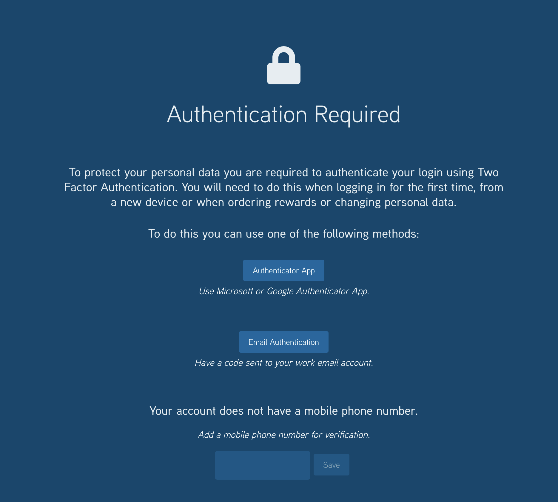To use 2FA you will be required to either add a mobile number OR add Teamo to your preferred authenticator app if you are not logging in via Single Sign On (SSO). The first time you log in you will see this screen: